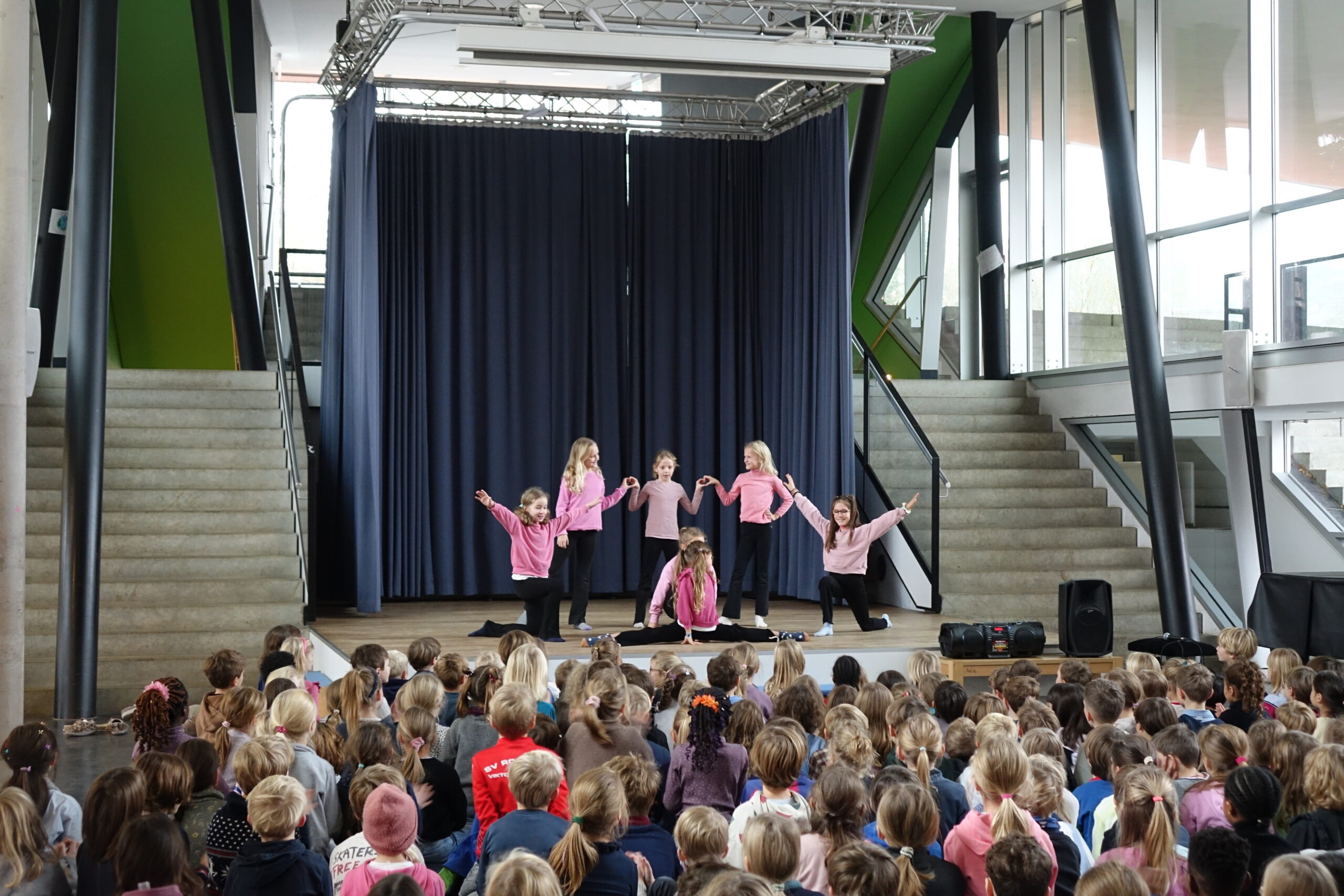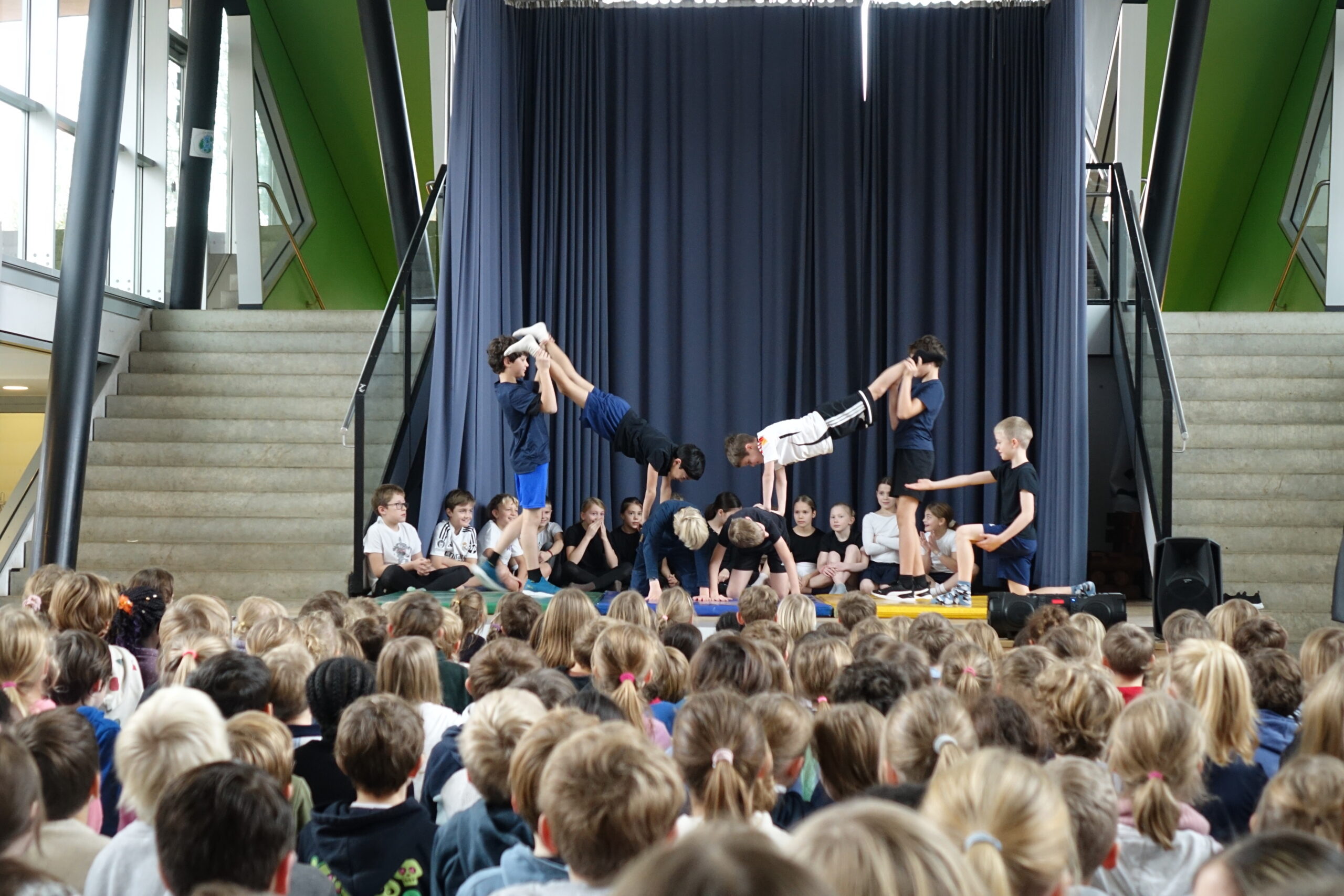 Danach präsentierte die 4b das Gedicht „Herr von Ribbeck“, gefolgt von einem beschwingten Tanz von fünf Mädchen aus der 3d. Im Anschluss beeindruckte die 4d mit weiteren akrobatischen Kunststücken.