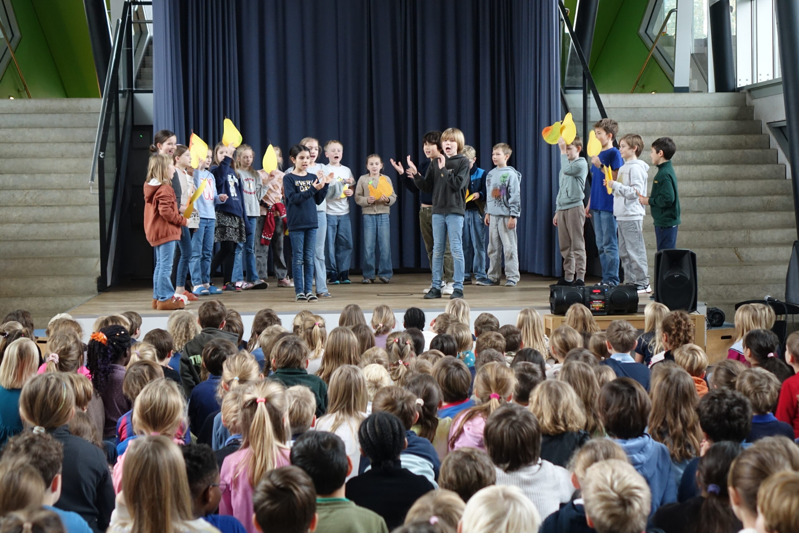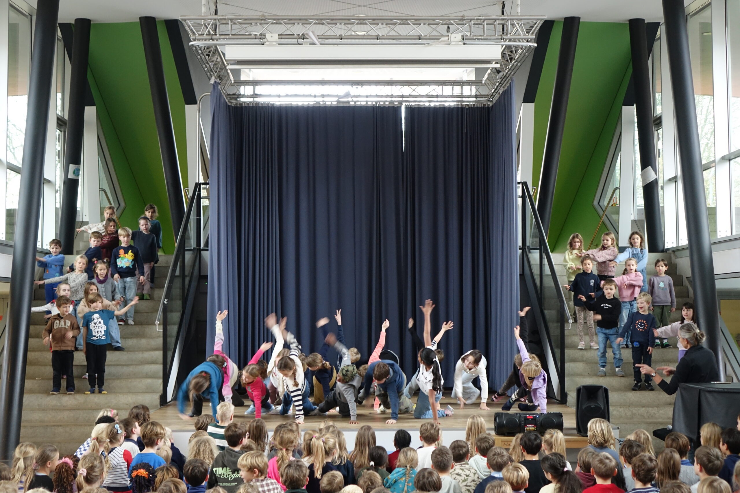 Außerdem stellte Frau Richter den Ablauf des diesjährigen Gorchi-Malwettbewerbs vor. Zum Abschluss füllte sich die Aula noch einmal mit Bewegung: Die Klassen 3c und 1d führten einen Mitmachtanz zum „Gute-Laune-Lied“ auf – ein fröhlicher Schlusspunkt unserer letzten Kinderbühne im Jahr 2025.